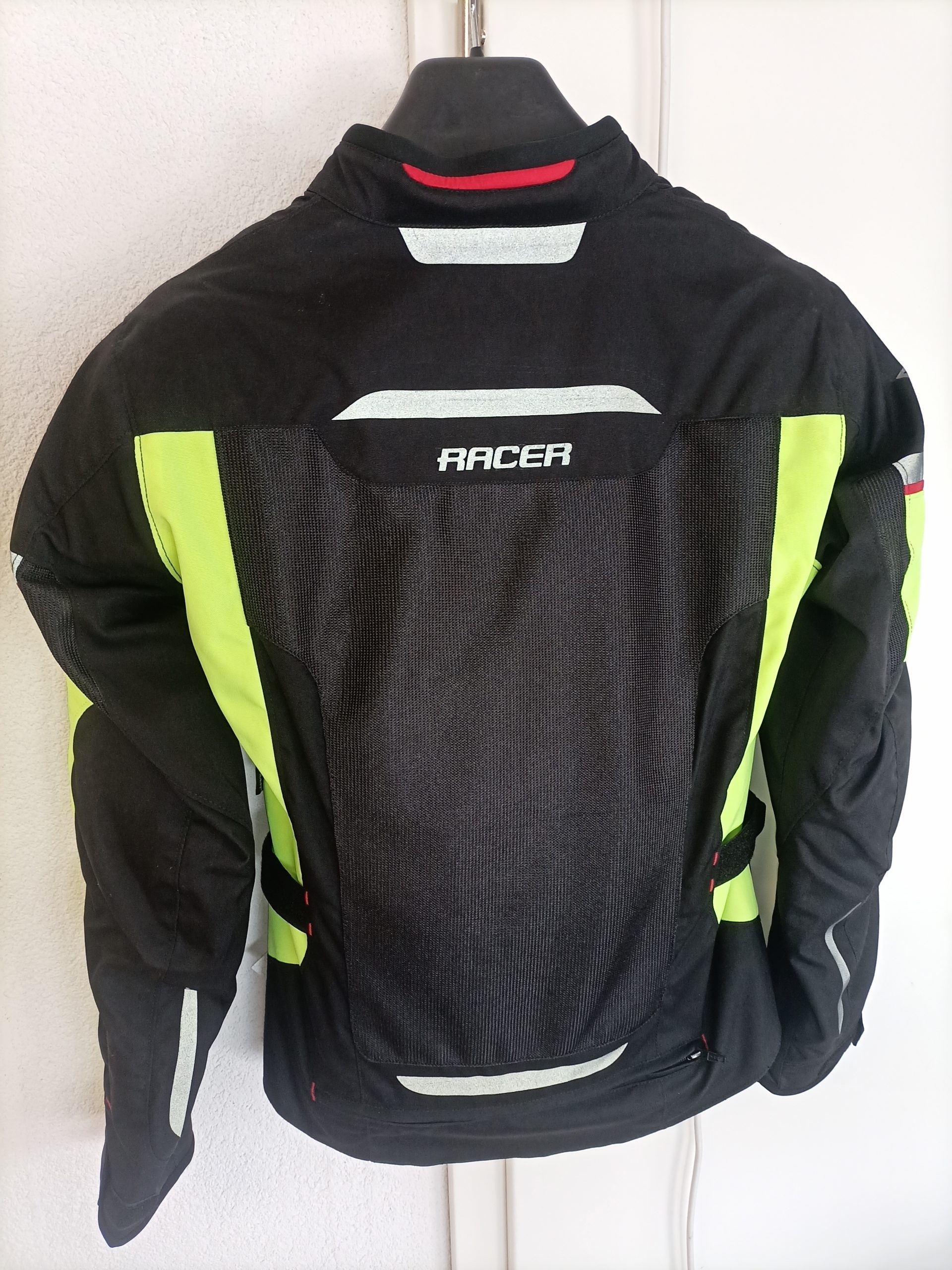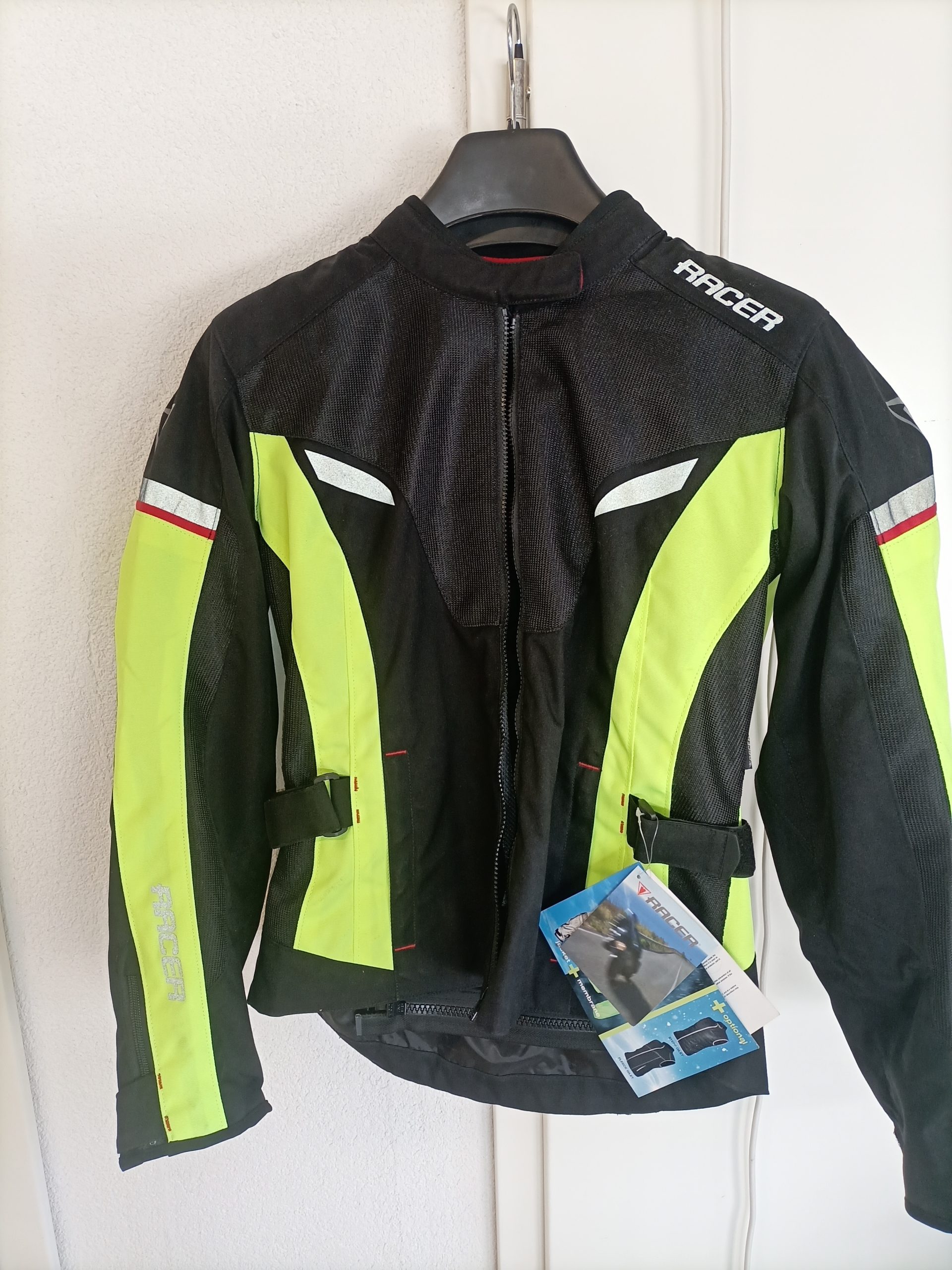 Leichte Sommerjacke mit Mesh-Einsätzen. Protektoren an Ellbogen, Schultern und Rücken. Neongelbe wasserdichte Regenjacke in der Rückentasche, die bei Bedarf abgezippt und außen getragen werden kann.