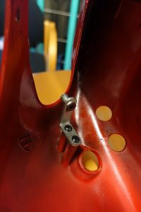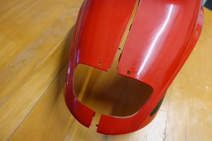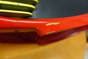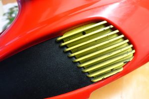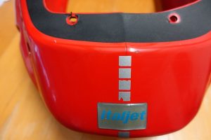 Heckverkleidung vom Roller Italjet Formula 50 in der Originalfarbe rot. Die Lüftergitter wurden gelb lackiert. Die Verkleidung hat keine Strukturschäden und nur kleine Kratzer auf beiden Seiten.