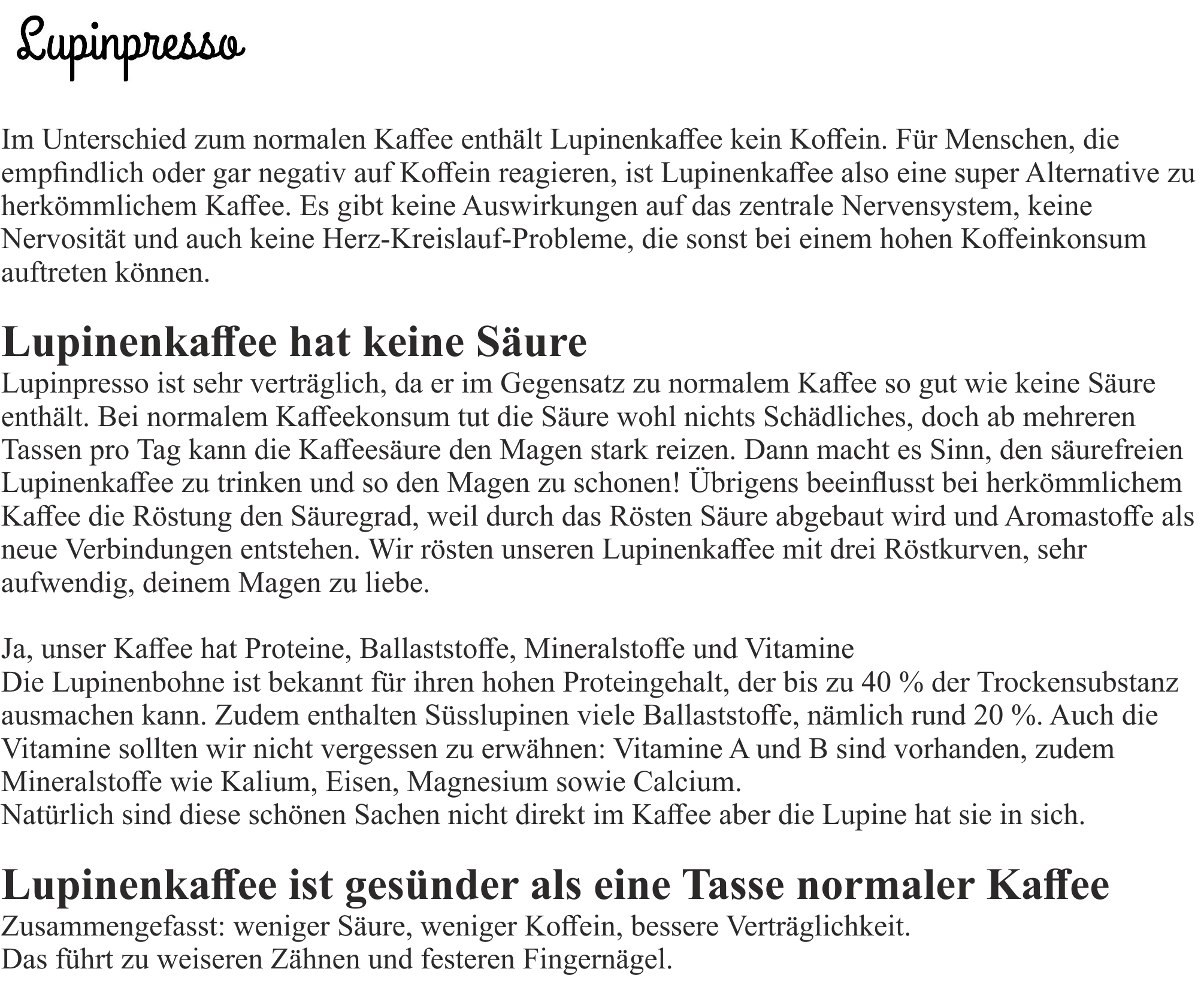 Durch die starke Röstung, mit einer langen Röstdauer und höheren Temperatur von über 25 Minuten Dauer, erhält er den besonderen Geschmack. Der Lupinpresso
